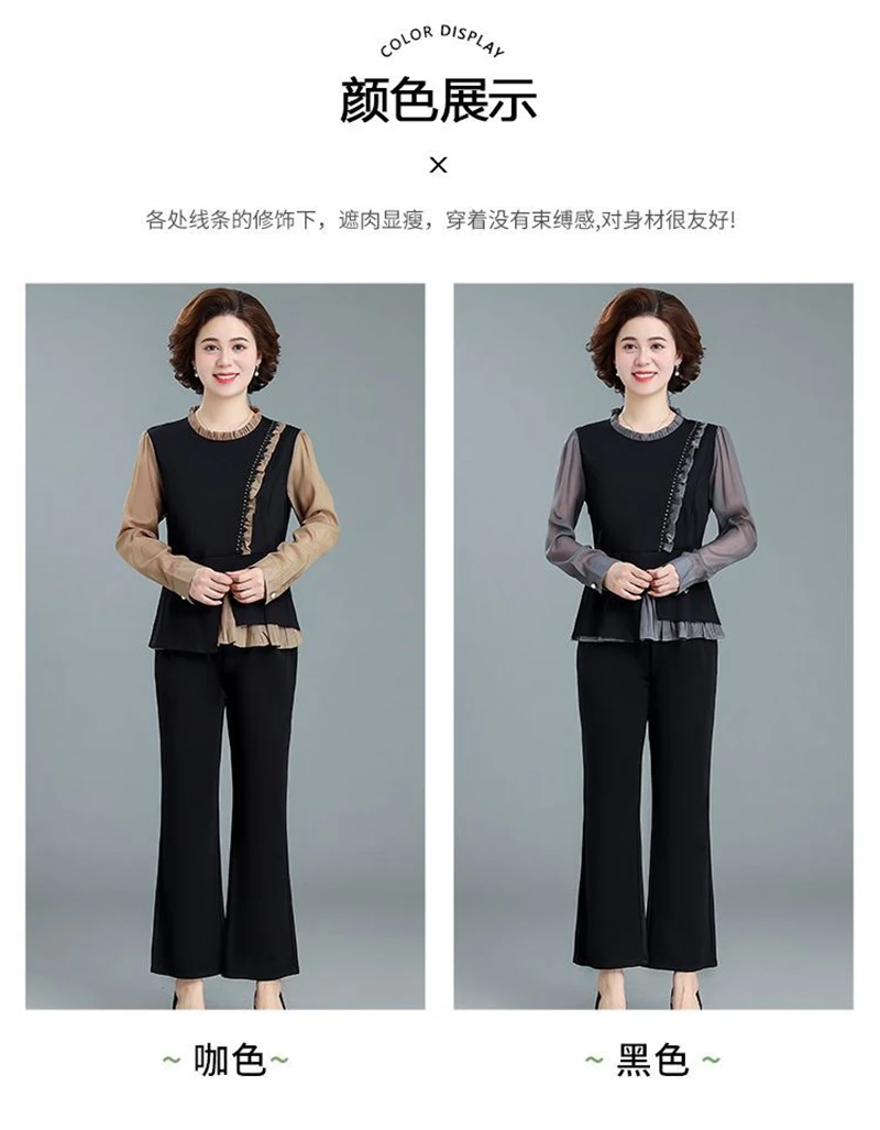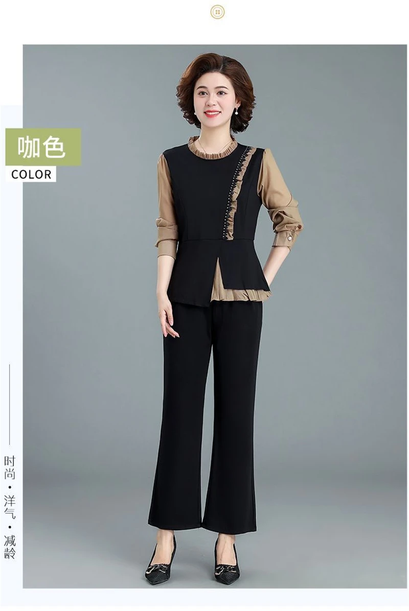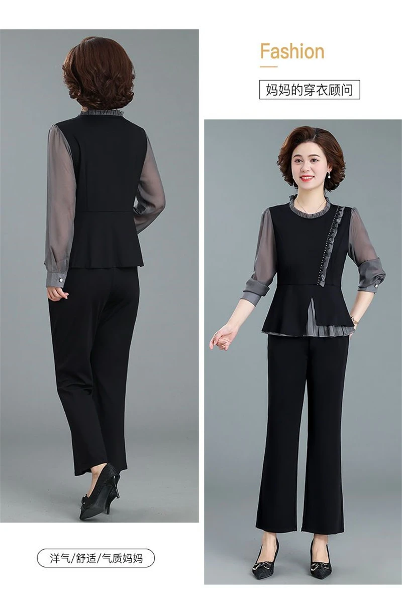 Middle Aged Mom Fashion 2 Piece Set Women Outfit Elegant Ruffles Long Sleeve Blouse And Ankle Length Pant Suit Conjunto Femenino