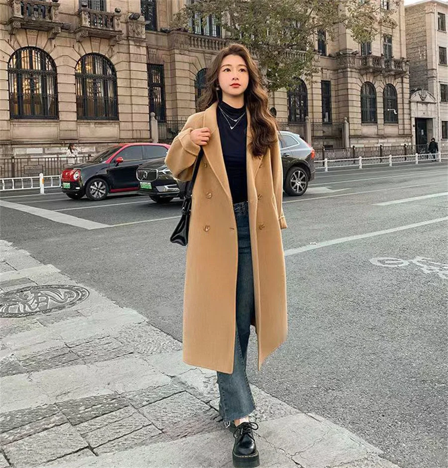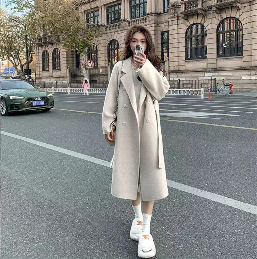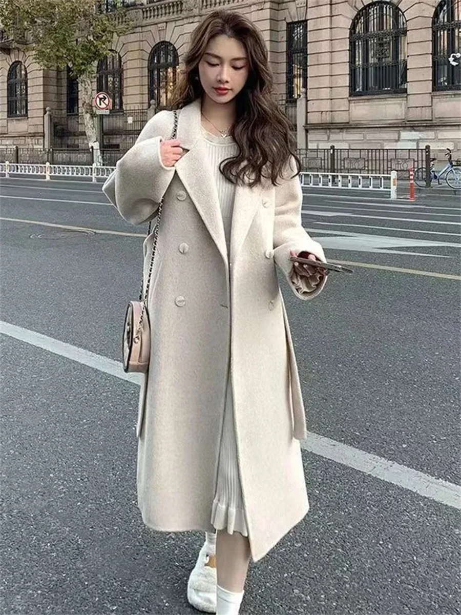 Streetwear Mid Length Woolen Coat Jackets Warm Baggy Double Breasted Jaqueta Overcoat Thick Korean Belt Wool Blend Outerwear New